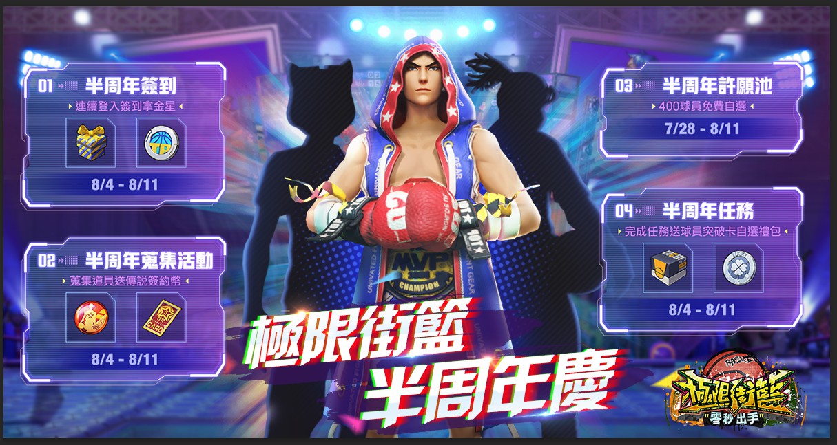 除了各種遊戲內外一系列半週年慶活動外,極限街籃社群平台也會有一系列社群活動,還沒加入極限街籃的玩家趕緊到到 Google Play、Apple Store 下載最新版本,並且追蹤極限街籃社群,獲得最新遊戲資訊和專屬社群活動獎勵!