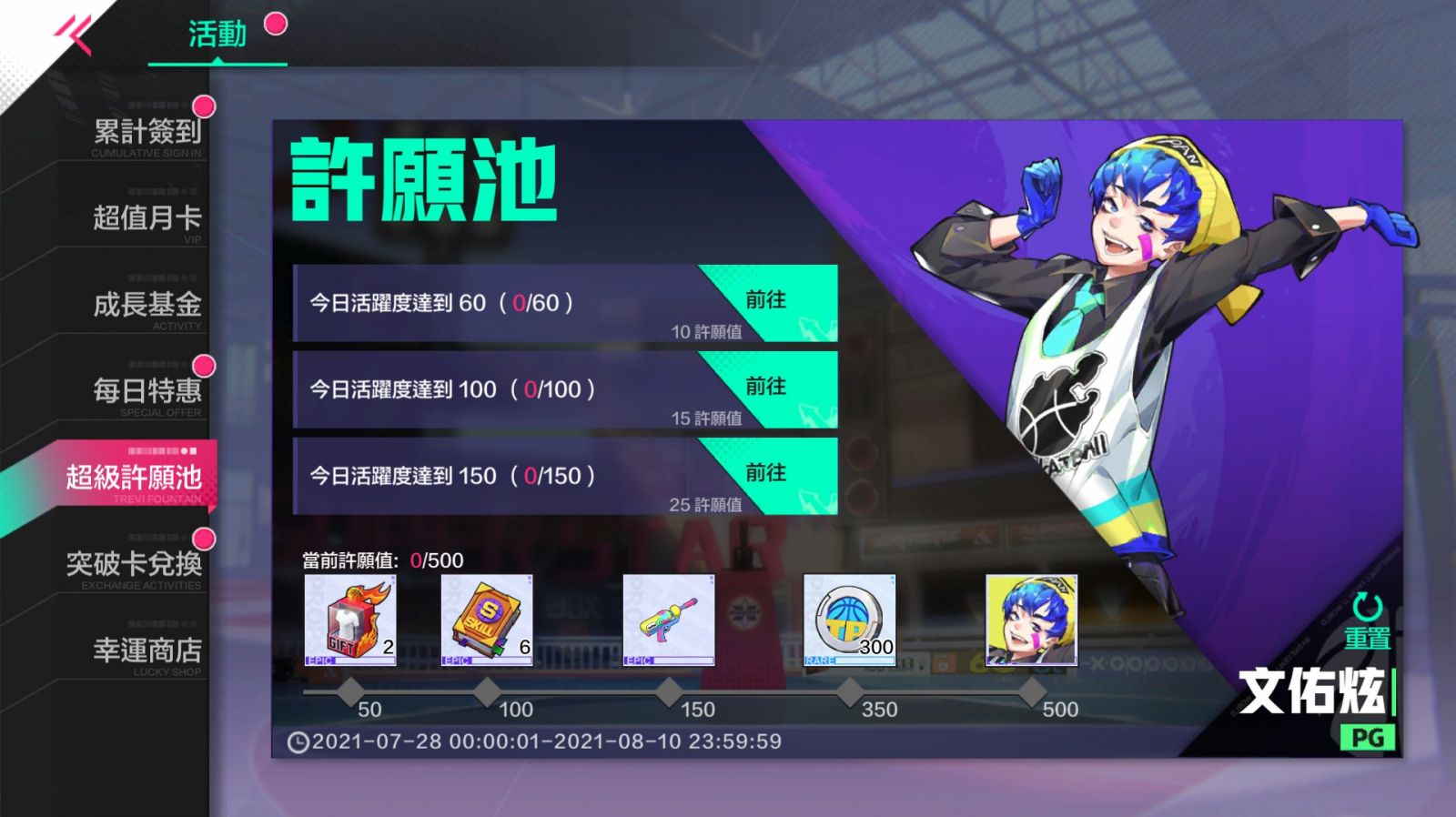 在活動期間,玩家每日的活躍度皆可用來累積許願值,除了得到高級技能書、水槍時裝、突破幣等各式獎勵外,許願值達500時即可從特選400角色中任選一個,不用抽自己選!
